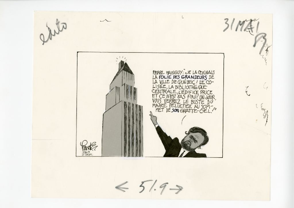 Pierre Mainguy: "Je la connais la folie des grandeurs de la ville de Québec! Le Colisée, la bibliothèque centrale, l'édifice Price et ce n'est pas fini! Un jour, vous verrez le buste du maire Pelletier au sommet de son gratte-ciel!"