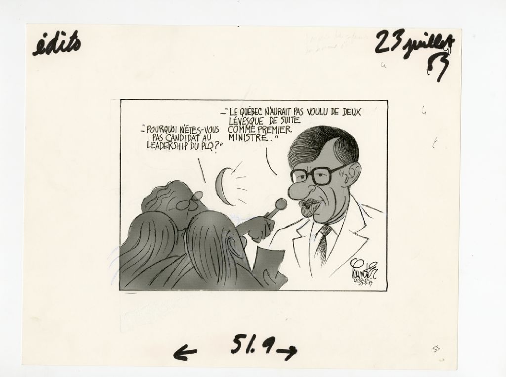 "Pourquoi n'êtes-vous pas candidat au leadership du PLQ?" "Le Québec n'aurait pas voulu de deux Lévesque de suite comme premier ministre.", 23 juillet 1983, Archives nationales à Québec, Fonds Raoul Hunter, (03Q,P716,S1,P83-07-23), Raoul Hunter.