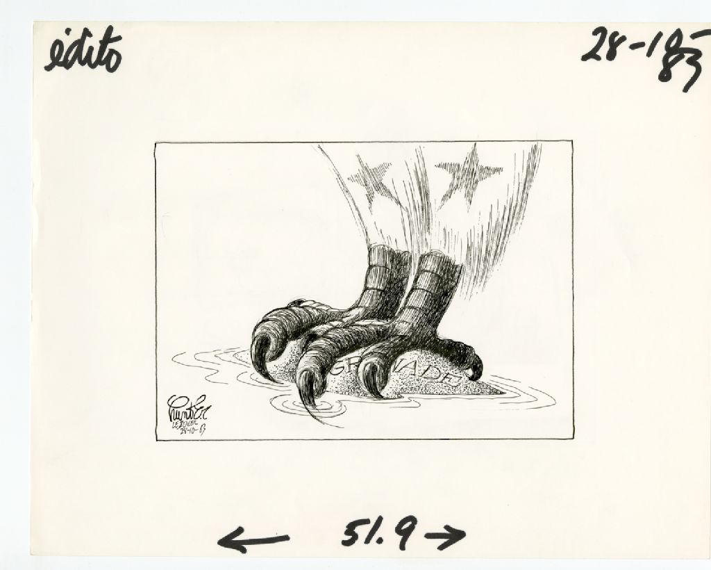 [Des serres d'aigles sont posés sur un rocher où on peut lire ''Grenade'']