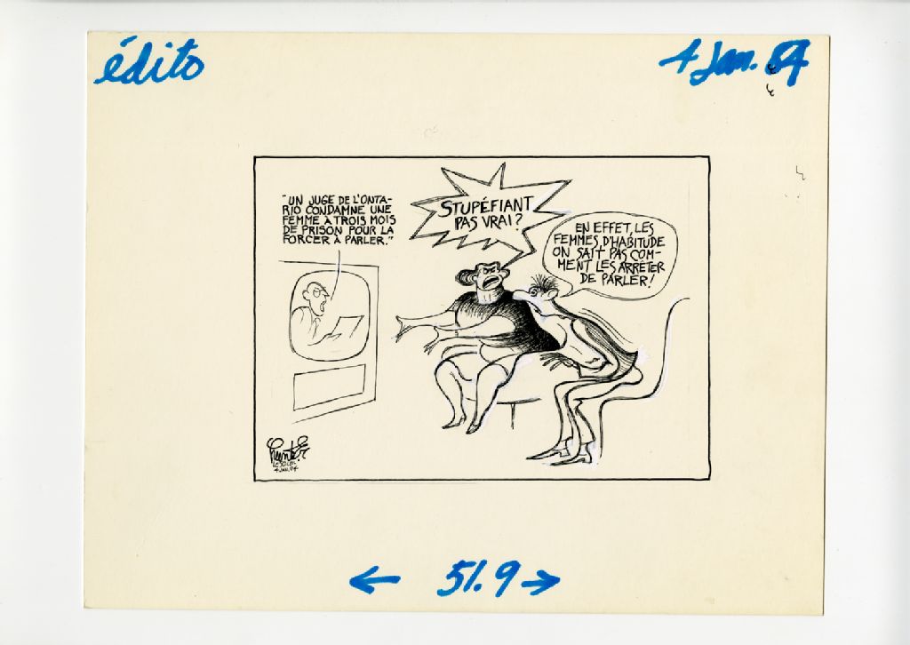 "Un juge de l'Ontario condamne une femme à trois mois de prison pour la forcer à parler." "Stupéfiant pas vrai?" "En effet, les femmes d'habitude on sait pas comment les arrêter de parler!"