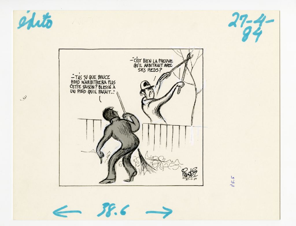 "T'as su que Bruce Hood n'arbitrera plus cette saison? Blessé à un pied qu'il parait..." "C'est bien la preuve qu'il arbitrait avec ses pieds?"