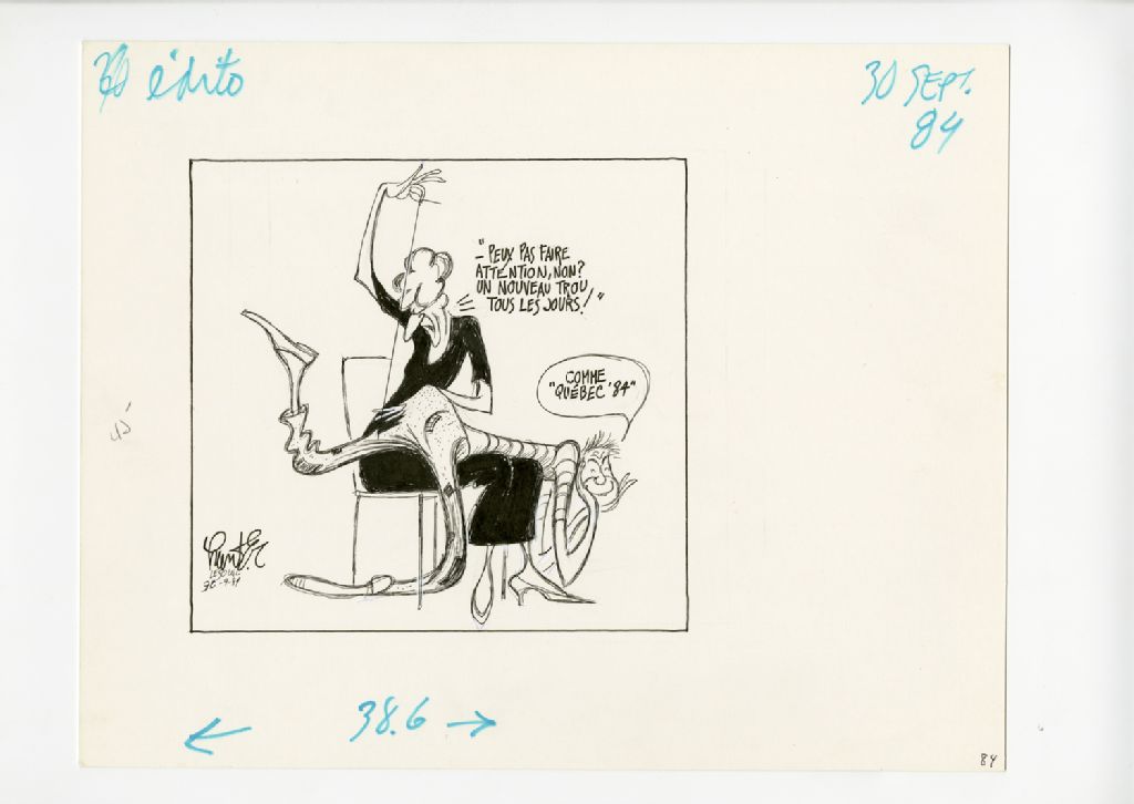 "Peux pas faire attention, non? Un nouveau trou tous les jours!" "Comme "Québec '84"!", 30 septembre 1984, Archives nationales à Québec, Fonds Raoul Hunter, (03Q,P716,S1,P84-09-30), Raoul Hunter.