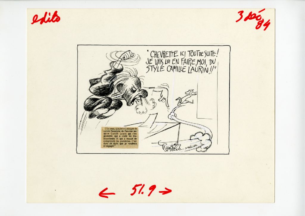 "Chevrette ici tout de suite! Je vais lui en faire, moi, du style Camille Laurin!", 03 décembre 1984, Archives nationales à Québec, Fonds Raoul Hunter, (03Q,P716,S1,P84-12-03), Raoul Hunter.
