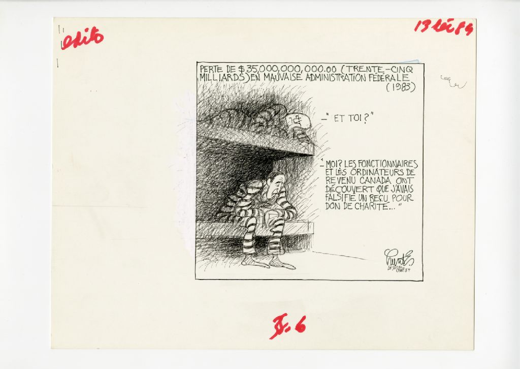 Perte de 35 000 000 000$ (trente-cinq milliards) en mauvais administration fédérale (1983). "Et toi?" "Moi? Les fonctionnaires et les ordinateurs de Revenu Canada ont découvert que j'avais falsifié un reçu pour don de charité..."