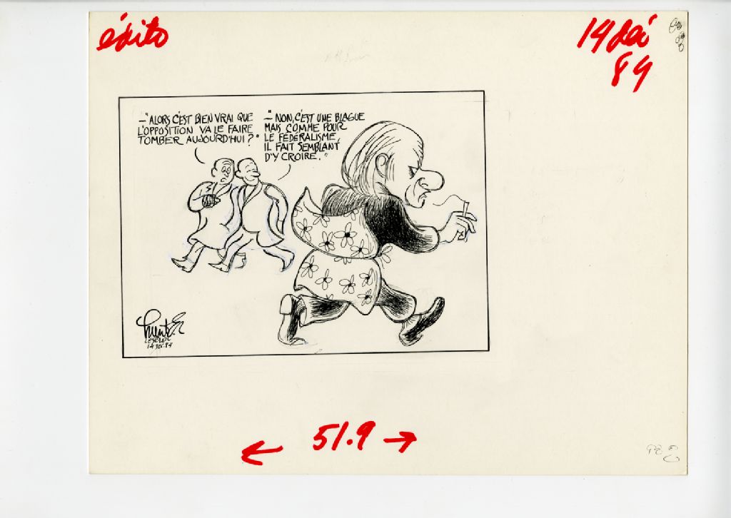 "Alors c'est bien vrai que l'opposition va le faire tomber aujourd'hui?" "Non, c'est blague mais comme pour le fédéralisme, il fait semblant d'y croire."