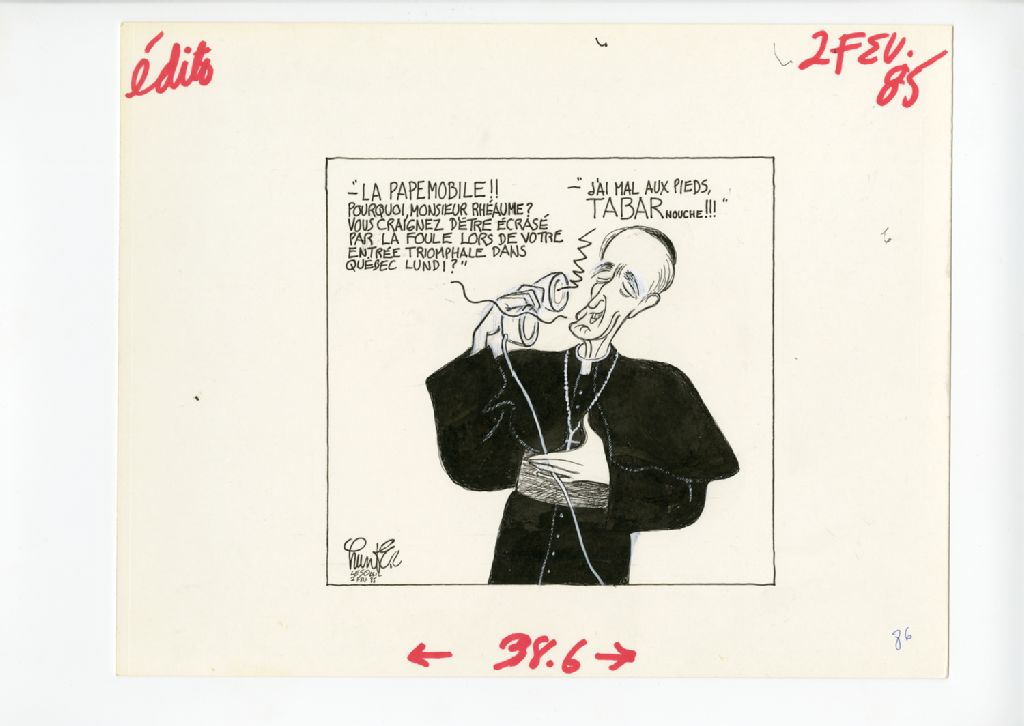"La papemobile!! Pourquoi, monsieur Rhéaume? Vous craigner d'être écrasé par la foule lors de votre entrée triomphale dans Québec lundi?" "J'ai mal au pieds, TABARnouche!!!"