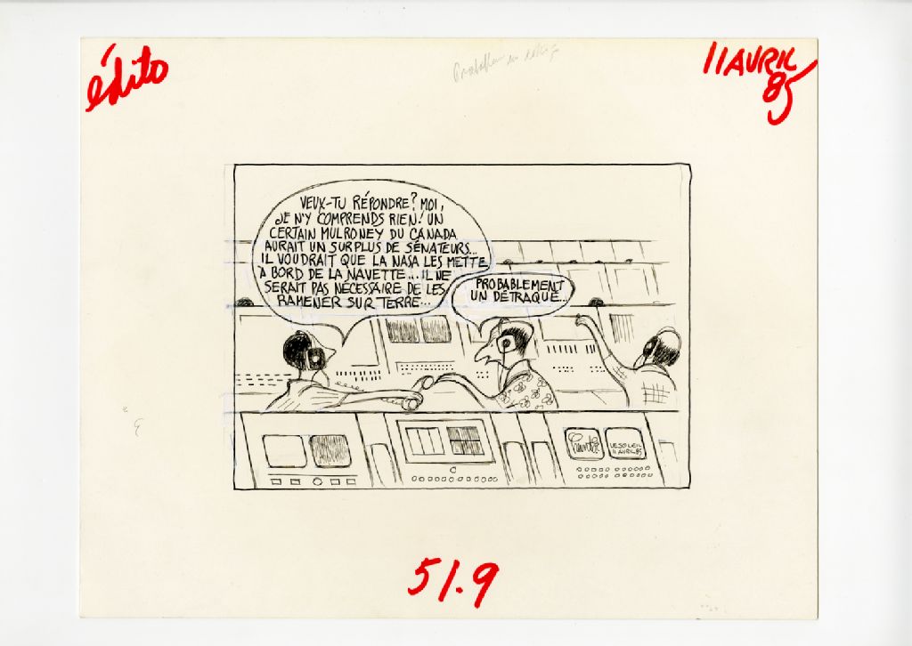 "Veux-tu me répndre? Moi, je n'y comprends rien! Un certain Mulroney du Canada aurait un surplus de sénateurs... Il voudrait que la NASA les mette à bord de la navette... Il ne serait pas nécessaire de les ramener sur terre..." "Probablement un détraqué..."