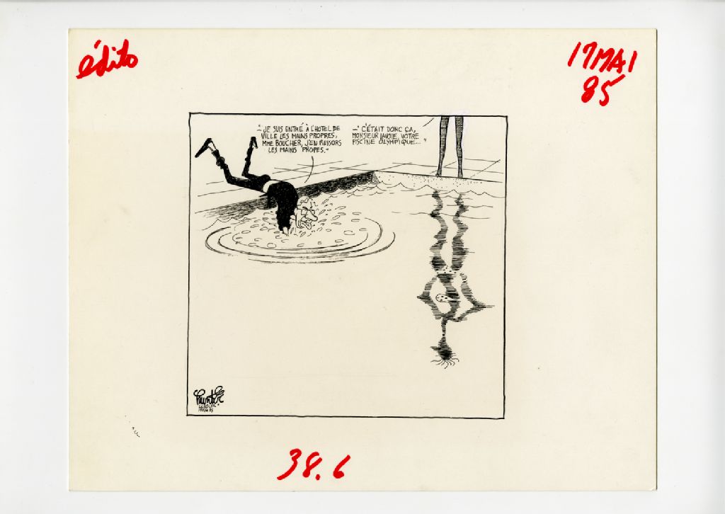 "Je suis entré à l'hôtel de ville les mains propre, Mme Boucher, j'en ressors les mains propres." C'était donc ça, monsieur Lavoie, votre piscine olympique...", 17 mai 1985, Archives nationales à Québec, Fonds Raoul Hunter, (03Q,P716,S1,P85-05-17), Raoul Hunter.