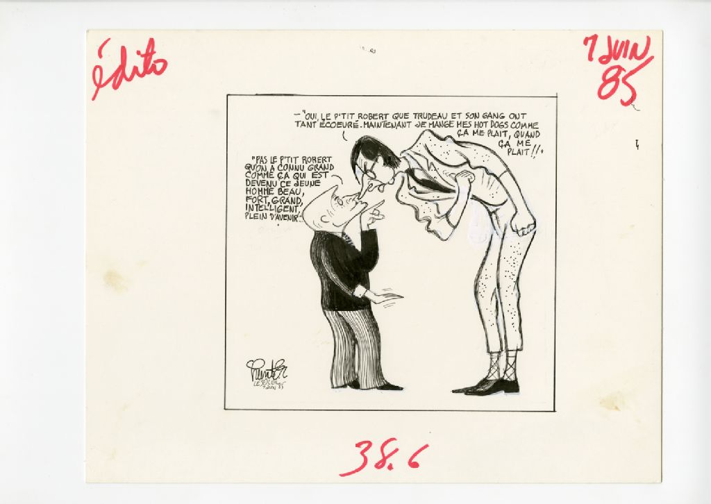 "Pas le p'titi Robert qu'on a connu grand comme ça qui est devenu ce jeune homme beau, fort, intelligent, plein d'avenir...""Oui, le petit Robert que Trudeau et son gang ont tant écoeuré. Maintenant je mange mes hot dogs comme ça me plaît!!", 07 juin 1985, Archives nationales à Québec, Fonds Raoul Hunter, (03Q,P716,S1,P85-06-07), Raoul Hunter.