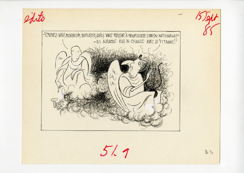 "Croyez-vous, monsieur Duplessis, qu'ils vont réussir à renflouer l'union nationale?" "Ils auraient plus de chance avec le Titanic!"
