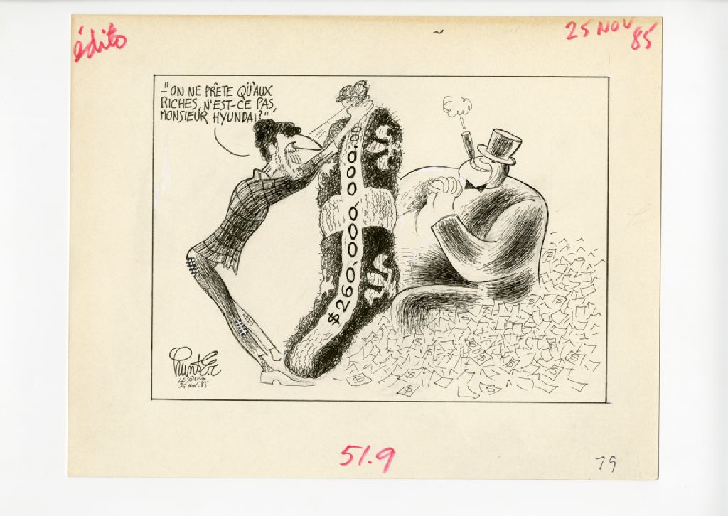 "On ne prête qu'aux riches, n'est ce pas, monsieur Hyundai?", 25 novembre 1985, Archives nationales à Québec, Fonds Raoul Hunter, (03Q,P716,S1,P85-11-25), Raoul Hunter.