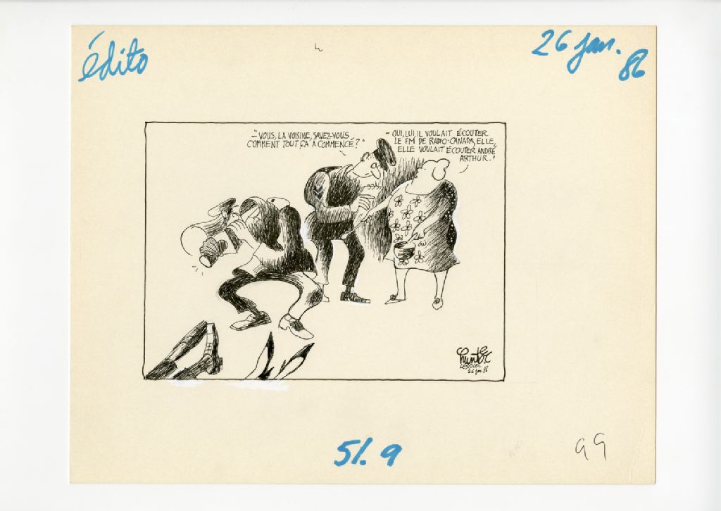 "Vous, la voisine, savez-vous comment tout ça a commencé?" "Oui, lui, il voulait écouter le FM de Radio-Canada, elle, elle voulait écouter André Arthur."