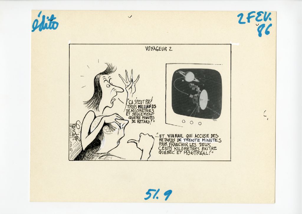 Voyageur 2. "Ça s'peut pas! Trois milliards de kilomêtres et seulement quatre minutes de retard?" "...Et Viarail qui accuse des retards de trentre minutes pour franchir les deux cents kilomêtres entre Québec et Montréal!", 02 février 1986, Archives nationales à Québec, Fonds Raoul Hunter, (03Q,P716,S1,P86-02-02), Raoul Hunter.