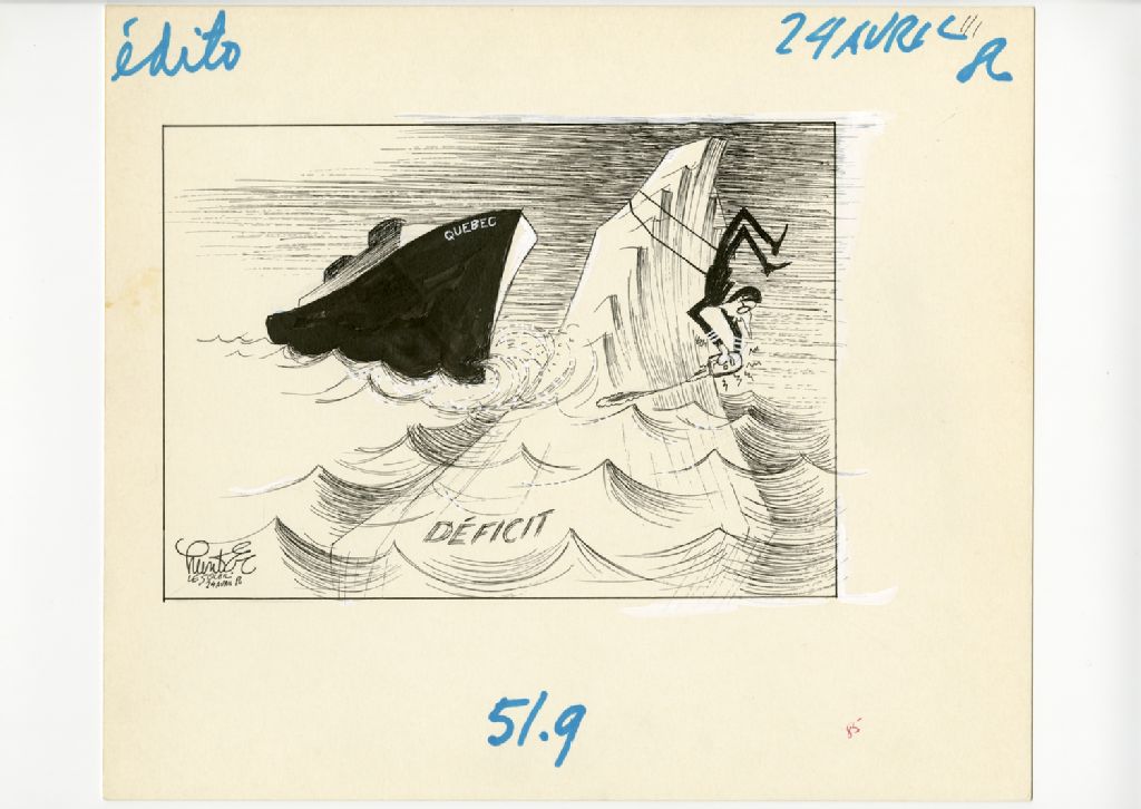 [Robert Bourassa en train de scier un iceberg alors qu'un paquebot approche]
