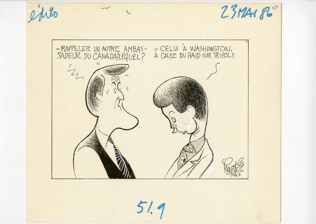 "rappeler un autre ambassadeur du Canada! Lequel?" "Celui à Washington, à cause du raid sur Tripoli."