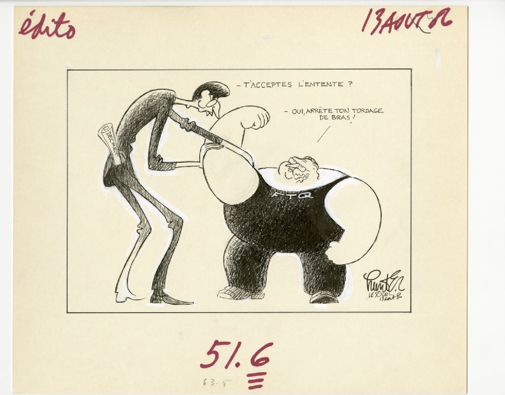 "T'acceptes l'entente?" "Oui, arrête ton tordage de bras!", 13 août 1986, Archives nationales à Québec, Fonds Raoul Hunter, (03Q,P716,S1,P86-08-13), Raoul Hunter.