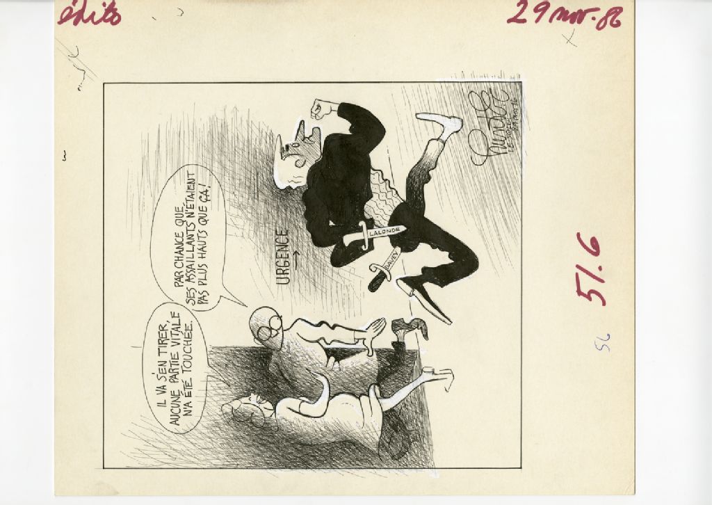 "Il va s'en tirer, aucune partie vitale n'a été touchée." "Par chance que ses assaillants n'étaient pas plus hauts que ça!"