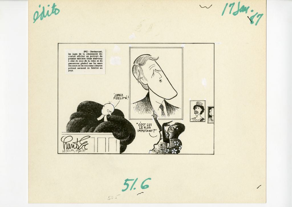 On peut lire sur une coupure de presse : "PC - Dorénavant, les juges de la citoyenneté devraient afficher un portrait du premier ministre Brian Mulroney à côté de ceux de la reine et du gouverneur général sur les murs des cours où les nouveaux citoyens prêtent serment de fidelité au pays."