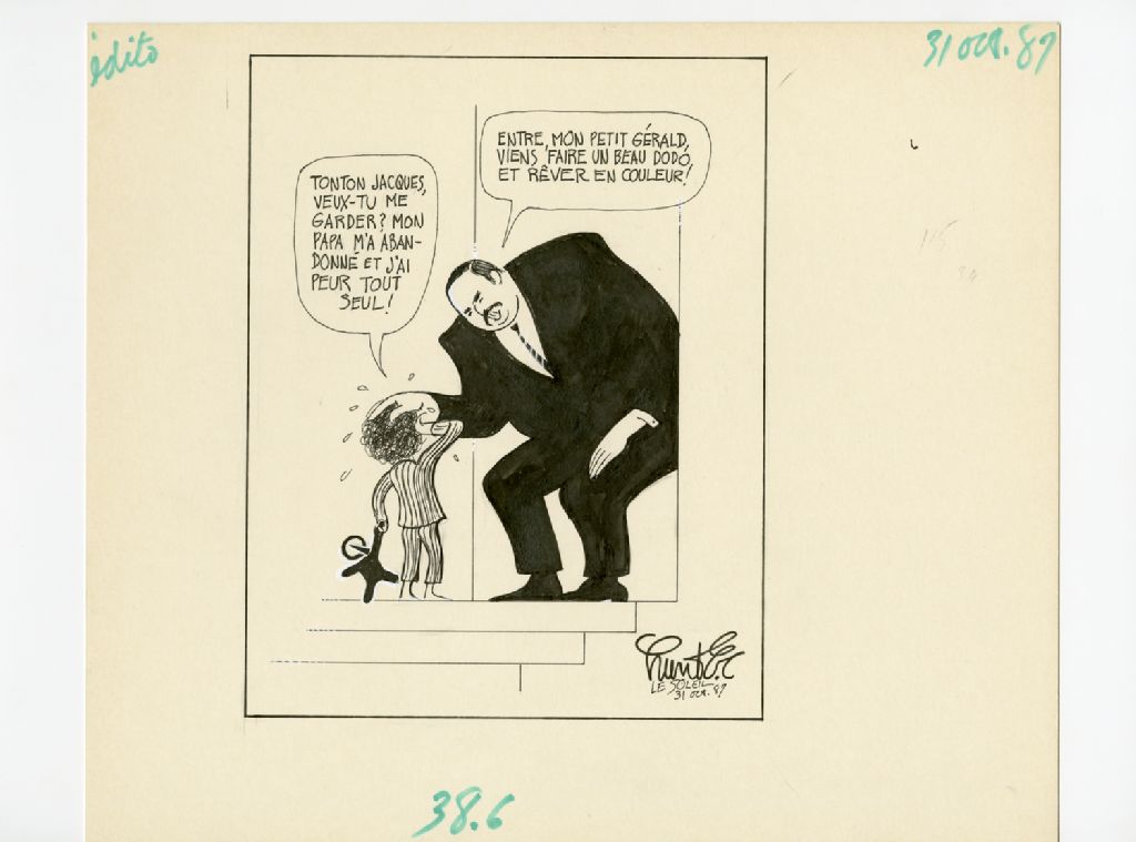 "Tonton Jacques, veux-tu me garder? Mon papa m'a abandonné et j'ai peur tout seul!" "Entre, mon petit Gérald, viens faire un beau dodo et rêver en couleur!"