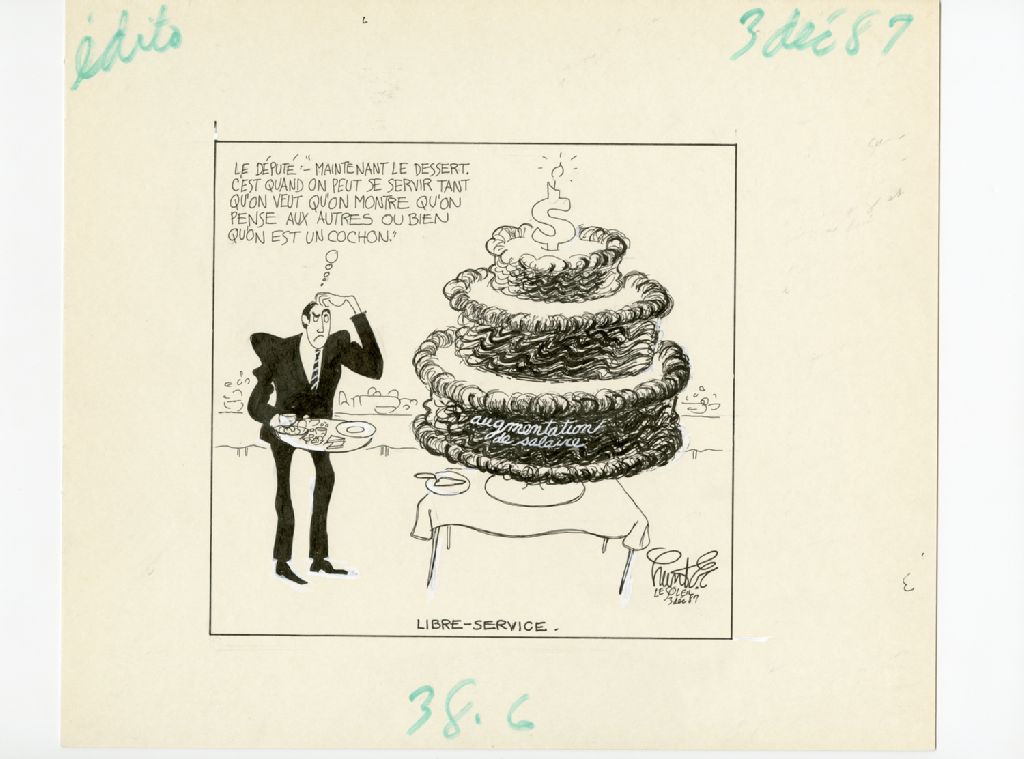 Libre-service. Le député: "Maintenant le dessert. C'est quand on peut se servir tant qu'on veut qu'on montre qu'on pense aux autres ou bien qu'on est un cochon.", 03 décembre 1987, Archives nationales à Québec, Fonds Raoul Hunter, (03Q,P716,S1,P87-12-03), Raoul Hunter.
