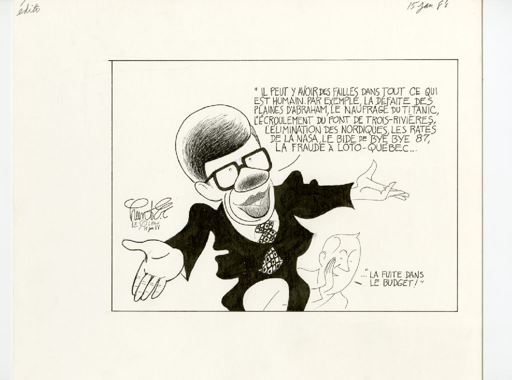 "Il peut y avoir des failles dans tout ce qui est humain. Par exemple, la défaite des plaines d'Abraham, le naufrage du Titanic, l'écroulement du pont de Trois-Rivières, l'élimination des Nordiques, les ratés de la Nasa, le bide de Bye Bye 87, la fraude à Loto-Québec..." "La fuite dans le budget!"