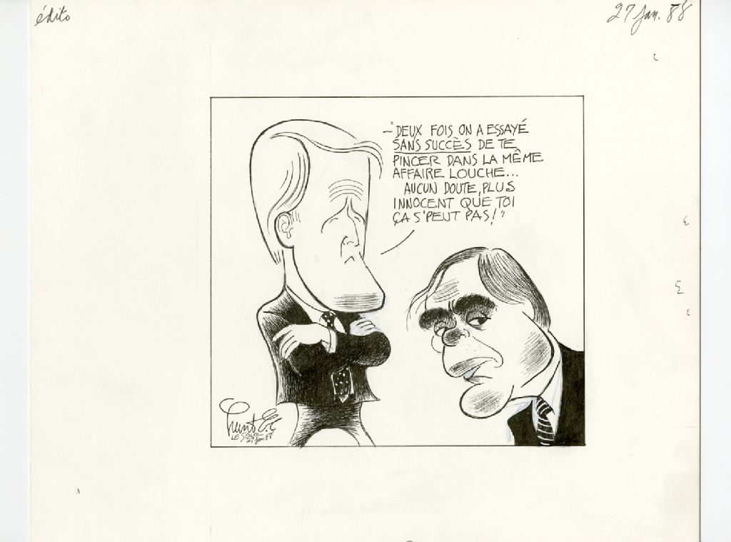 "Deux fois on a essayé sans succès de te pincer dans la même affaire louche... Aucun doute, plus innocent que toi, ça s'peut pas!", 27 janvier 1988, Archives nationales à Québec, Fonds Raoul Hunter, (03Q,P716,S1,P88-01-27), Raoul Hunter.