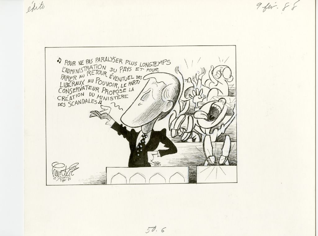 "Pour ne pas paralyser plus longtemps l'administration du pays et pour parer au retour éventuel des libéraux au pouvoir, le Parti conservateur propose la création du ministère des scandales"