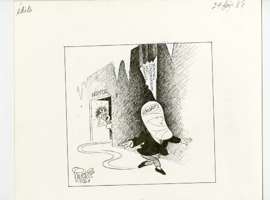 [Brian Mulroney sort d'un hôpital avec un bandage qui lui recouvre la tête sur lequel il est écrit ''Scandales'']