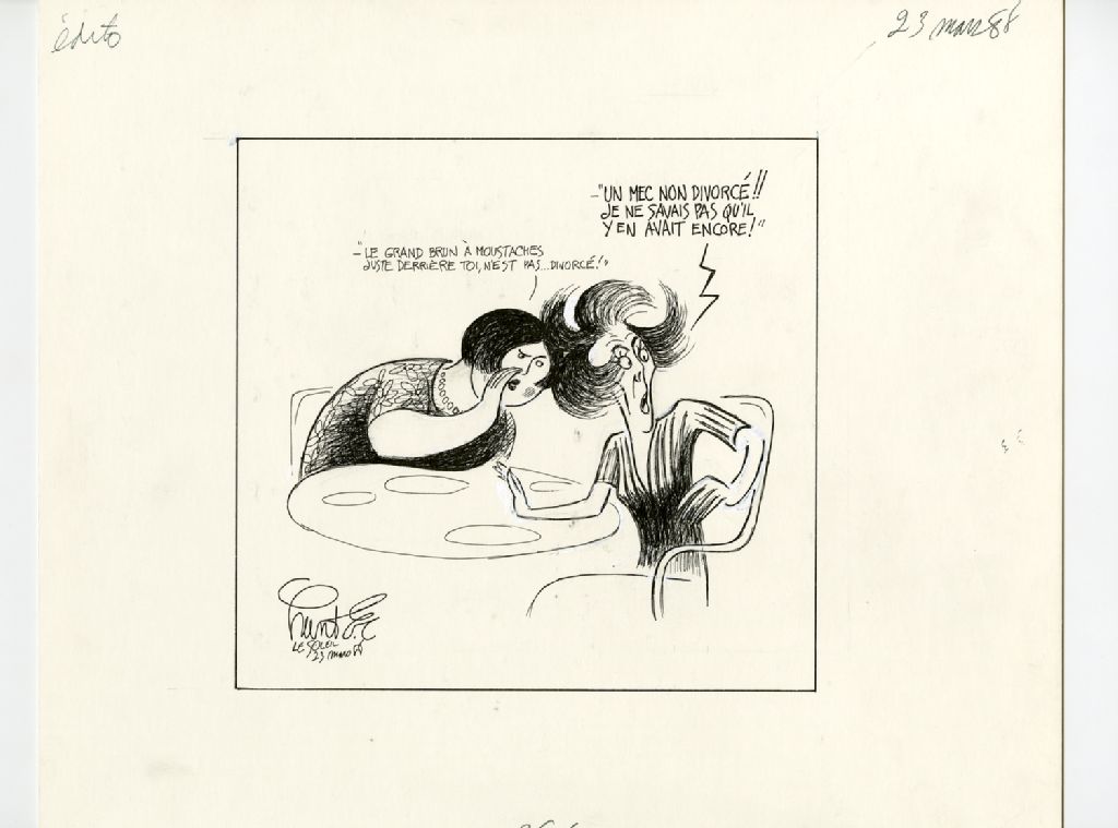 "Le grand brun à moustaches juste derrière toi, n'est pas... divorcé!" "Un mec non divorcé!! Je ne savais pas qu'il y en avait encore!"