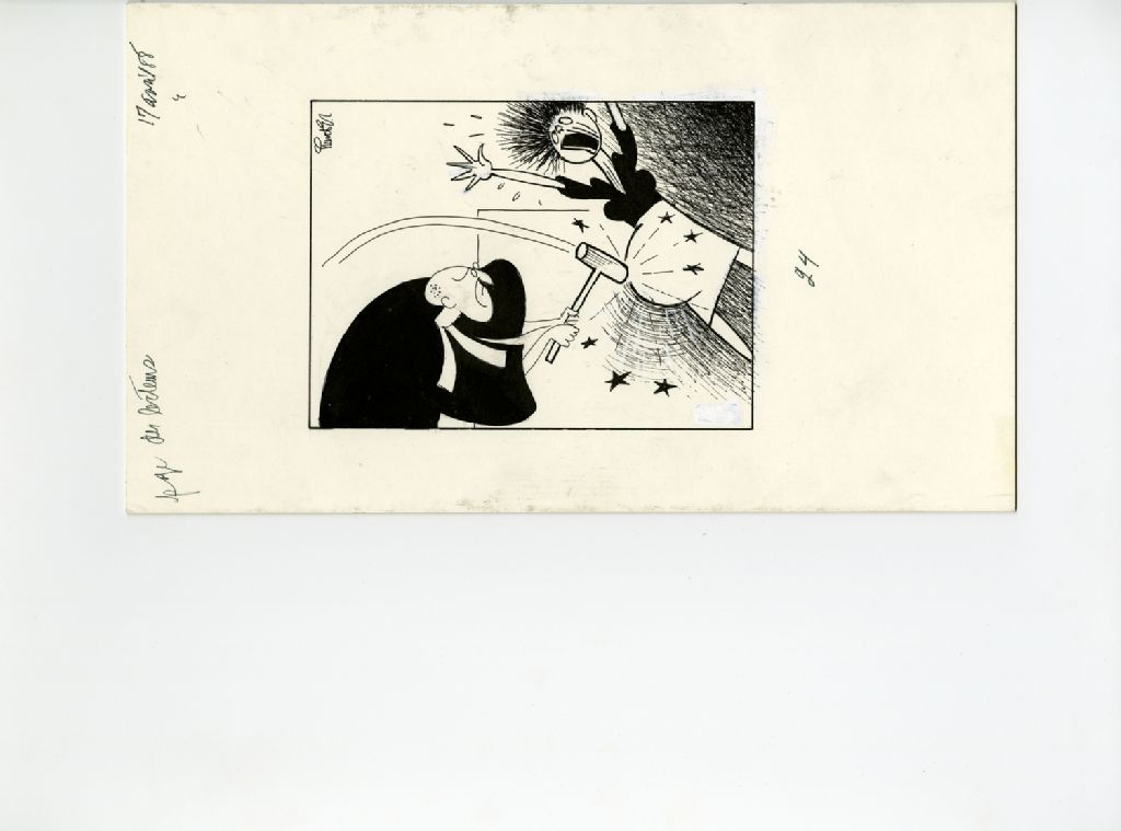 [Un juge donne un coup de marteau sur le ventre d'une femme enceinte], 17 avril 1988, Archives nationales à Québec, Fonds Raoul Hunter, (03Q,P716,S1,P88-04-17), Raoul Hunter.