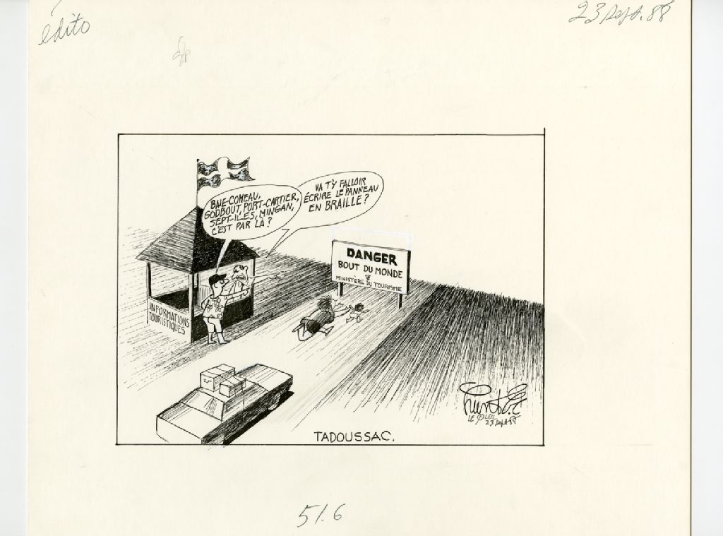 Tadoussac. "Baie-Comeau, Godbout, Port-Cartier, Sept-Iles, Mingan, c'est par là?" "Va t'y falloir écrire un panneau en braille?"