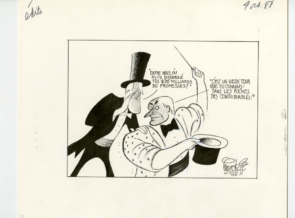 "Entre nous, où as-tu dissimulé tes $30 milliards, de promesses?" "C'est un vieux tour que tu connais: dans les poches des contribuables!", 04 octobre 1988, Archives nationales à Québec, Fonds Raoul Hunter, (03Q,P716,S1,P88-10-04-1), Raoul Hunter.