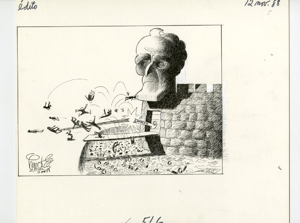 [Des gens essaient d'assiéger un château fort avec le visage de Claude Ryan]