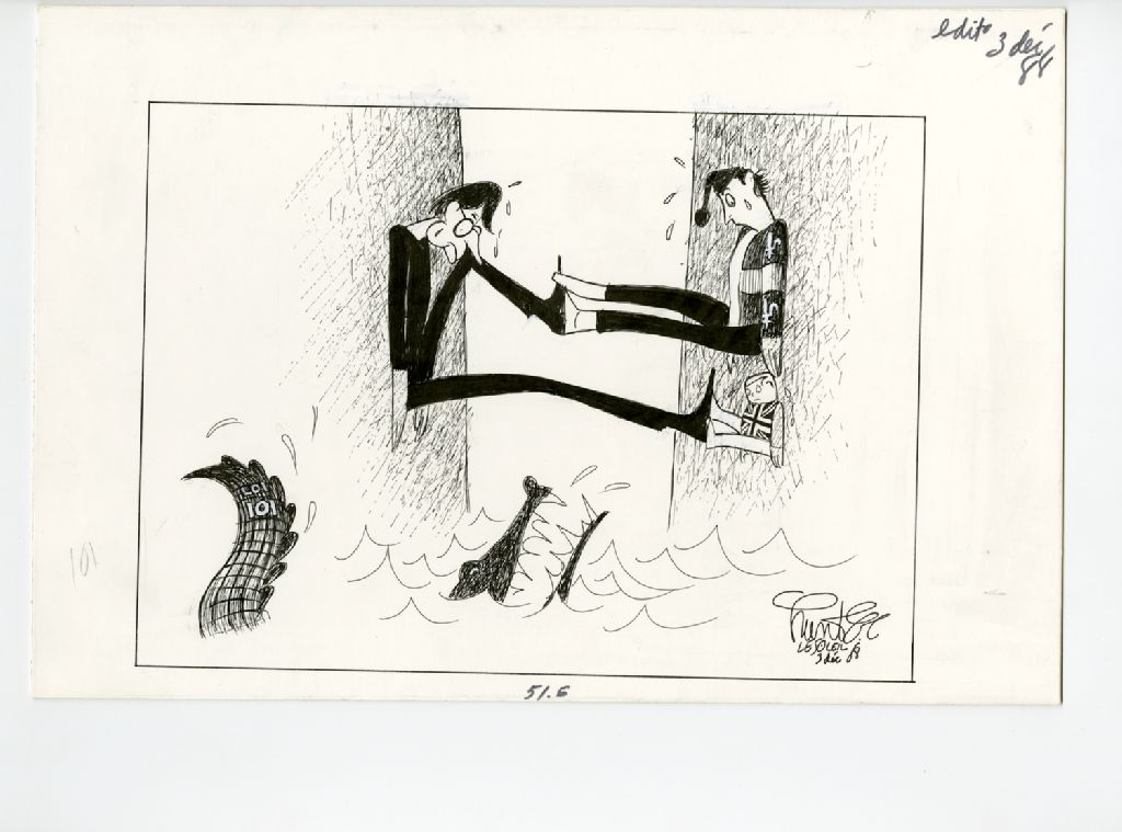 [Robert Bourassa se retenant pour ne pas tomber dans une fosse avec un crocodile]