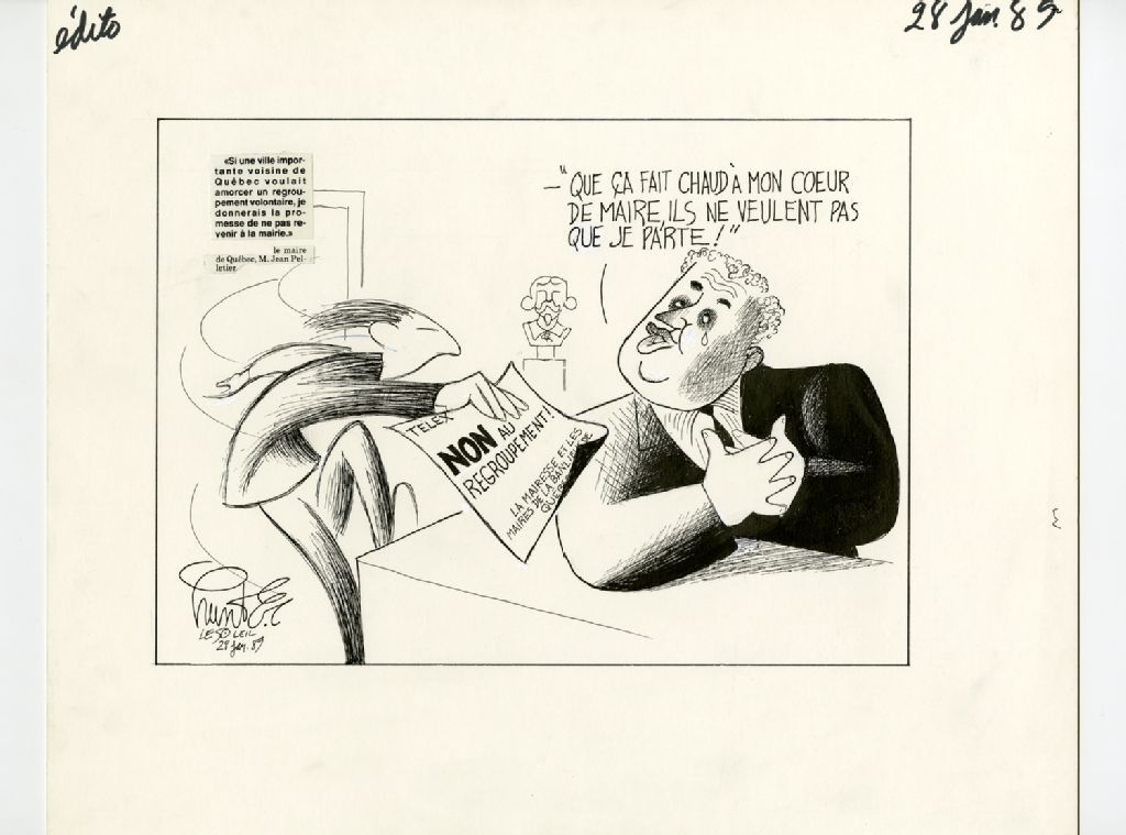 On peut lire sur une coupure de presse : "Si une ville importante voisine de Québec voulaut amorcer un regroupement volontaire, je donnerais la promesse de ne pas revenir à la mairie." Le maire de Québec, M. Jean Pelletier