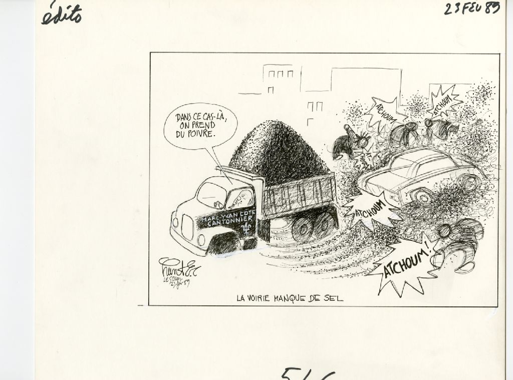La voirie manque de sel. "Dans ce cas-là, on prend du poivre.", 23 février 1989, Archives nationales à Québec, Fonds Raoul Hunter, (03Q,P716,S1,P89-02-23), Raoul Hunter.