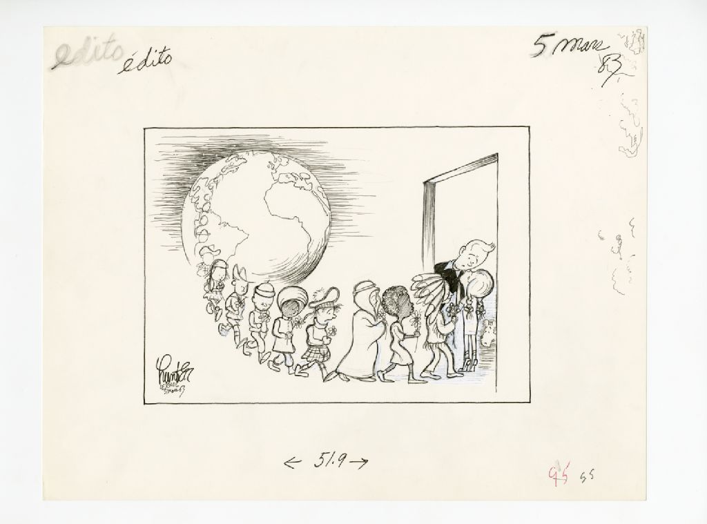 [Des enfants du monde entier font la file pour embrasser Tintin sur la joue]