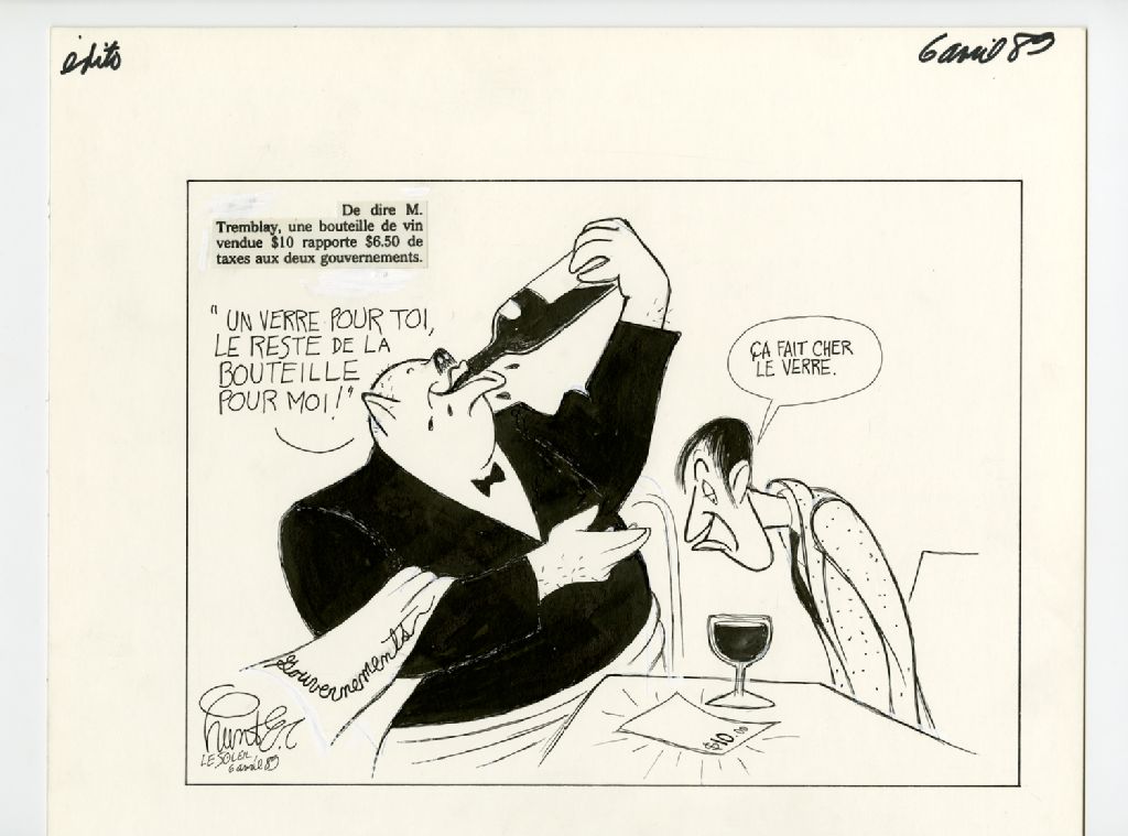 "Un verre pour toi, le reste de la bouteille pour moi!" "Ça fait cher le verre.", 06 avril 1989, Archives nationales à Québec, Fonds Raoul Hunter, (03Q,P716,S1,P89-04-06), Raoul Hunter.