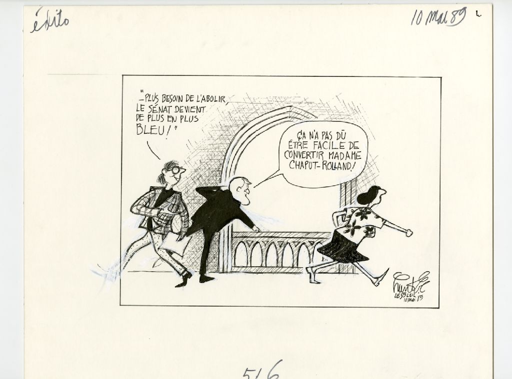 "Plus besoin de l'abolir, le sénat devient de plus en plus bleu!" "Ça n'a pas dû être facile de convertir madame Chaput-Rolland!", 10 mai 1989, Archives nationales à Québec, Fonds Raoul Hunter, (03Q,P716,S1,P89-05-10), Raoul Hunter.