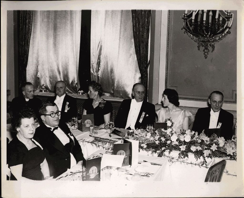 - Vue rapprochée de la table d'honneur, de gauche à droite: Ernest Dumais, Zéphirin Paquet, madame Lucien Laurin, Thomas Tremblay, madame René Nadeau et Joseph Bilodeau, lors du dîner officiel du centenaire de la compagnie Paquet à la salle de bal