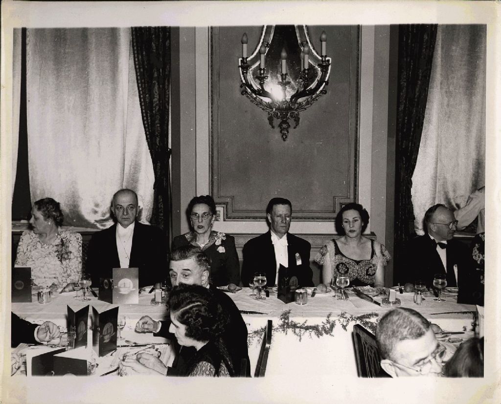Vue rapprochée de la table d'honneur, de gauche à droite: madame Eugène Paquet, Cyrille Vaillancourt, madame Antoine Rivard, Alexandre Paquet, madame Hughes Lapointe et Édouard Laurin, lors du dîner officiel du centenaire de la compagnie Paquet à la salle de bal