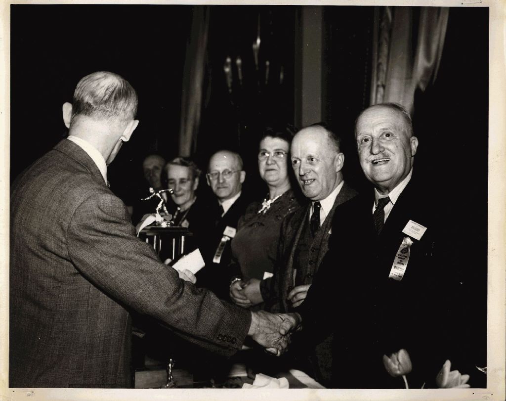 - Vue éloignée de la table d'honneur du centre vers la droite : madame Alexandre Paquet, Alexandre Paquet et Zéphirin Paquet, lors du dîner annuel des employés la compagnie Paquet à la salle de bal