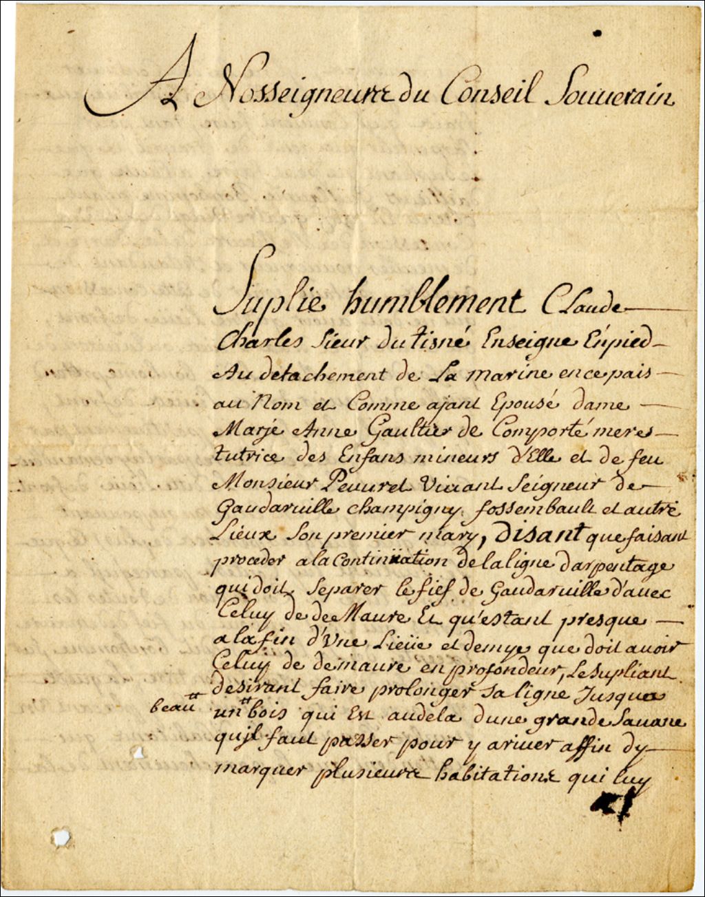 Requête au Conseil souverain par Claude-Charles Dutisné, enseigne des troupes de la Marine, contre Guillaume Bonhomme, capitaine de milice de la Côte Saint-Michel, concernant la ligne d'arpentage devant séparer le Fief de Gaudarville d'avec celui de Maure, signée par Dutisné et Monseignat