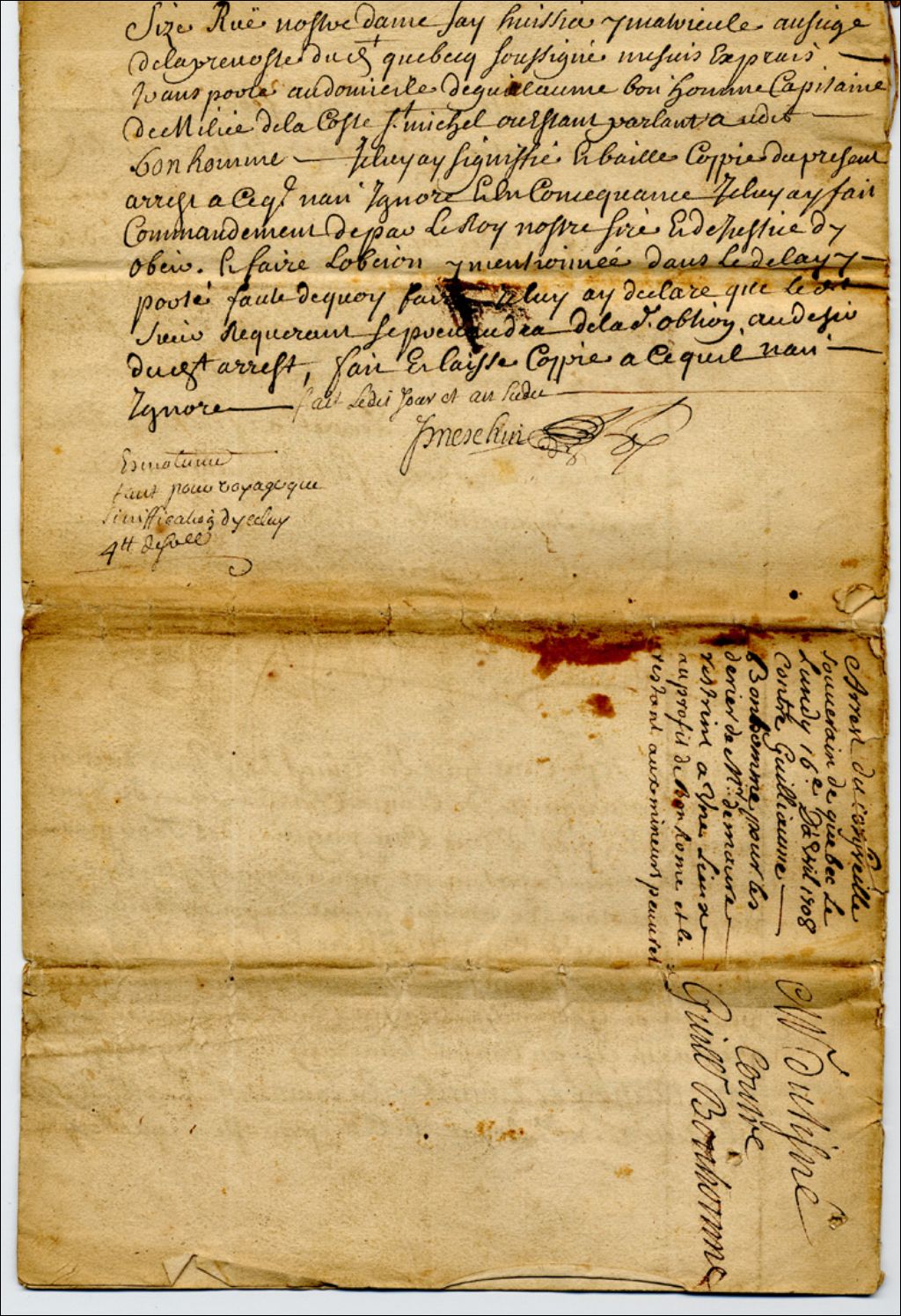 - Arrêt du Conseil souverain de Québec contre Guillaume Bonhomme, capitaine de milice de la Côte Saint-Michel, concernant la ligne d'arpentage devant séparer les Seigneuries de Gaudarville et de Maure, signé par Monseignat
