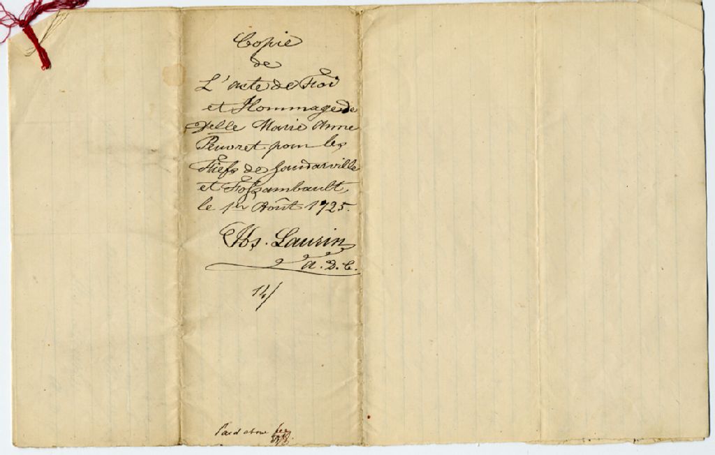 - Copie par Joseph Laurin, notaire, de l'acte de foi et hommage de Demoiselle Marie-Anne Peuvret pour les Fiefs de Gaudarville et Fossambault, le 1er août 1725