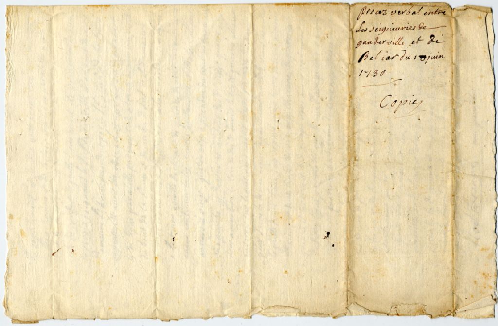 Copie du procès-verbal d'arpentage entre les Seigneuries de Gaudarville et de Bélair, par Noël Beaupré, arpenteur royal, les 12 et 13 avril 1730, 10 juin 1730, Archives nationales à Québec, Collection Pierre-Paul Côté, (03Q,P745,P26).