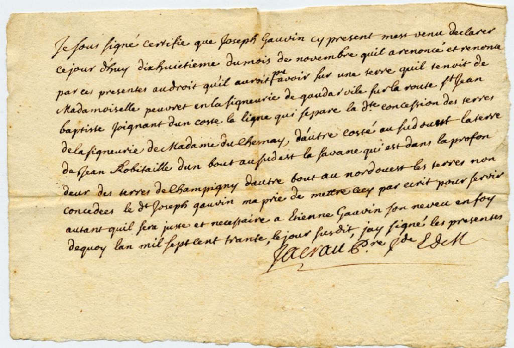 Renonciation de Joseph Gauvin à ses droits sur une terre de la Seigneurie de Gaudarville, qu'il tenait de Mademoiselle Peuvret, sur la route Saint-Jean-Baptiste, 18 novembre 1730, Archives nationales à Québec, Collection Pierre-Paul Côté, (03Q,P745,P27).
