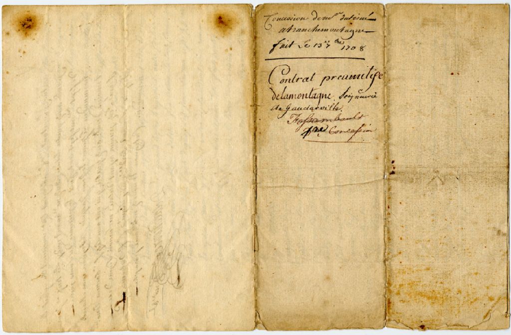 Concession d'une terre et habitation dans la Seigneurie de Gaudarville, par Claude Charles Dutisné, enseigne en pied d'une compagnie des troupes de la Marine, à Pierre Lalande, soldat, signée par Florent de Lacetière, notaire royal, 13 septembre 1708, Archives nationales à Québec, Collection Pierre-Paul Côté, (03Q,P745,P29).