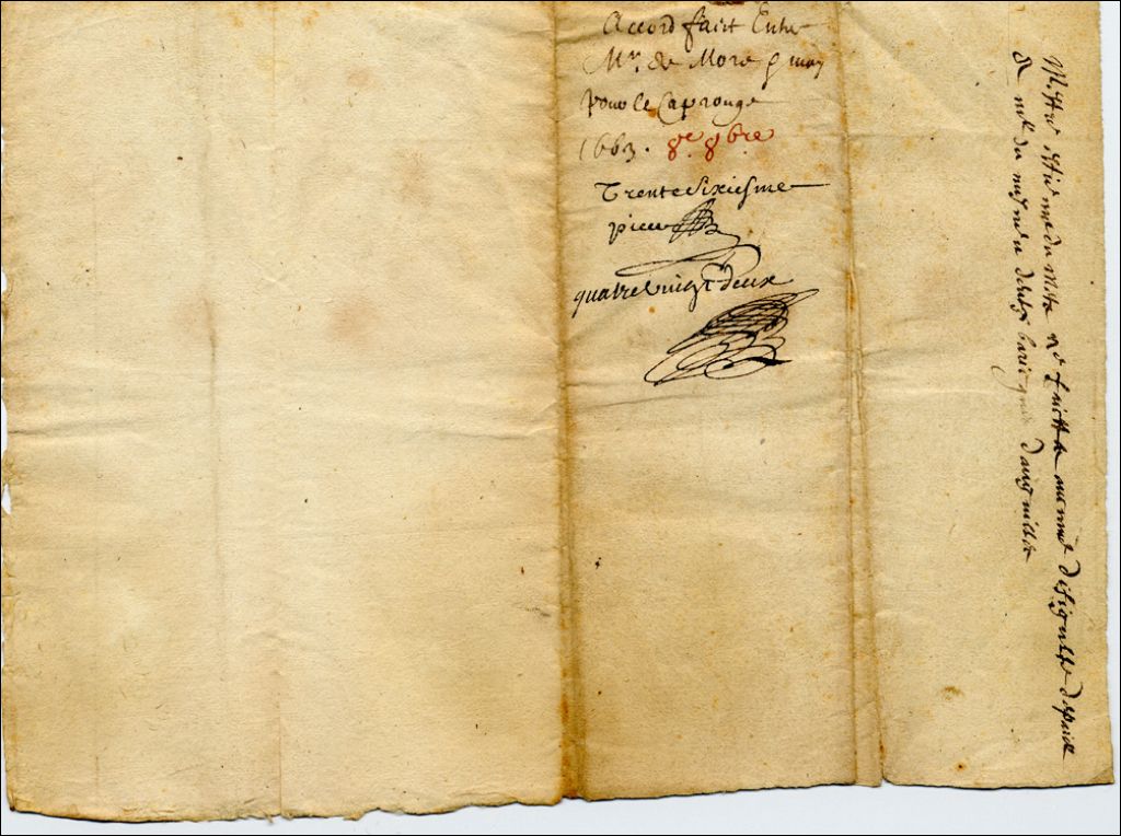 Accord concernant des barriques d'anguilles au Cap Rouge, signé par Juchereau de Maur, 8 octobre 1663, Archives nationales à Québec, Collection Pierre-Paul Côté, (03Q,P745,P37).