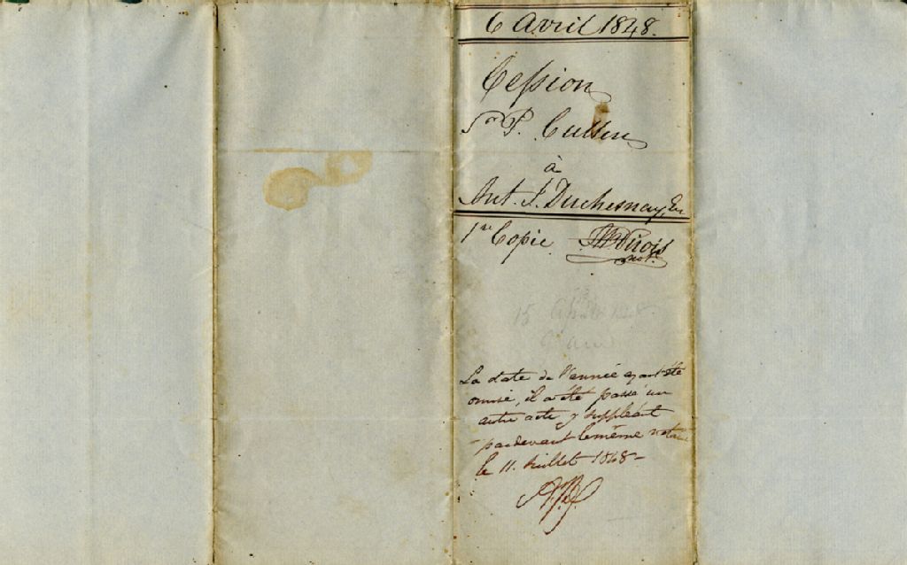 - Copie signée par A. B. Sirois, notaire, de la cession par Peter Cullen, serviteur, à Antoine Juchereau Duchesnay, écuyer, avocat, d'un lot de terre situé en la paroisse Sainte-Catherine de Fossambault
